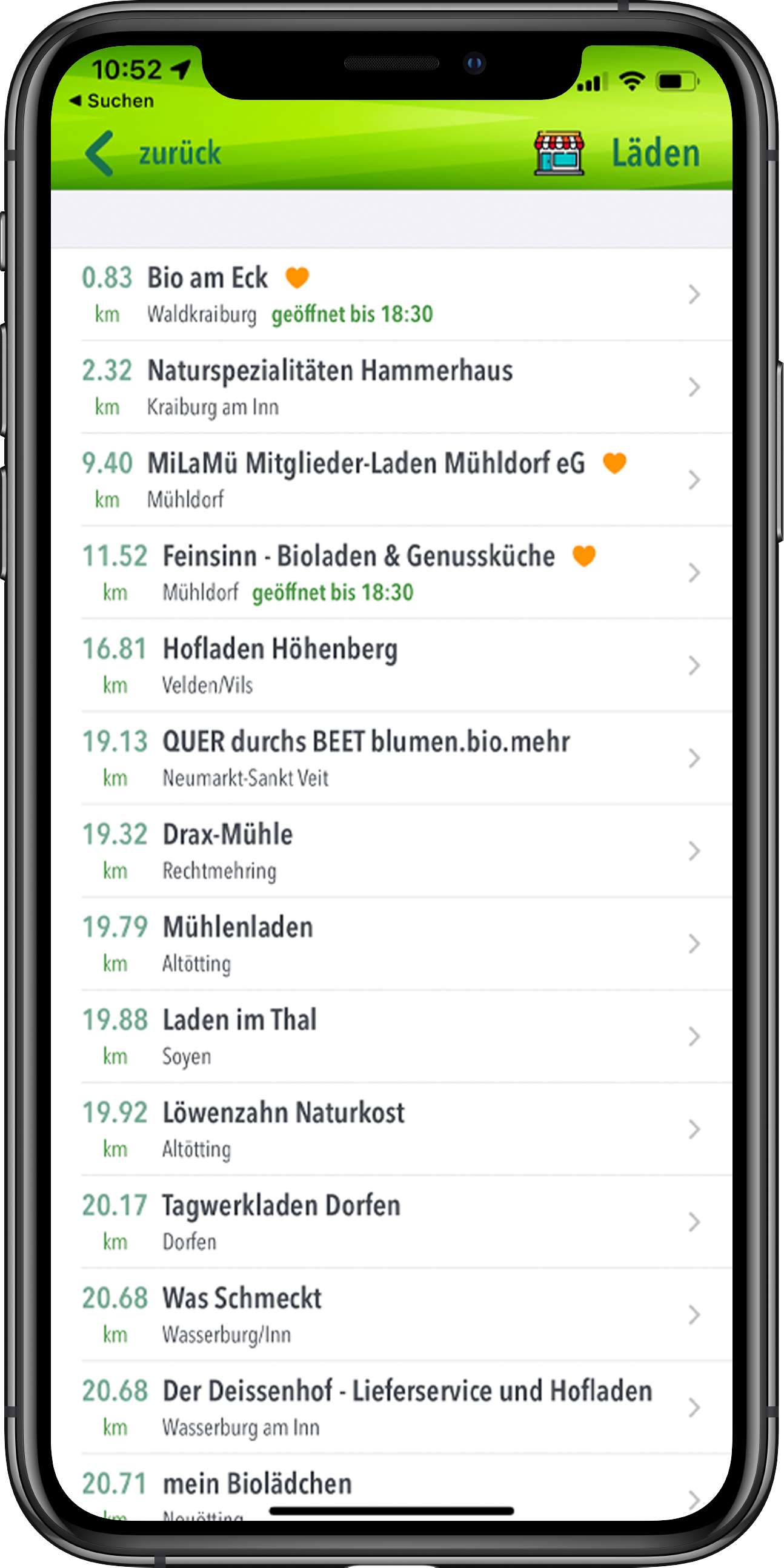 Durch die App erreichen wir zwei wesentliche Ziele. Erstens, Du lernst Deine Bio-Läden in der Nähe besser kennen und welche Produkte sie führen. Zweitens, durch Deine Favoriten (und anderer App-User) ist es dem Bio-Laden möglich, sein Sortiment besser abzustimmen. So findest Du immer häufiger, Deine Lieblingsprodukte im Bio-Laden.